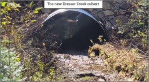 A local contractor, J&P Services, completed the Dresser Creek culvert replacement in October 2023 with construction oversight by staff from Trout Unlimited and IPNF. After purchasing the new squashed steel culvert, hauling the necessary rock material, installing the new culvert, and resurfacing the road, the construction of the project was finished. According to Trout Unlimited’s North Idaho Program Manager, Erin Plue, “Stream work on the downstream side of the culvert allowed the slope in the culvert to be reduced, helping to assure long-term benefit of this pipe.”